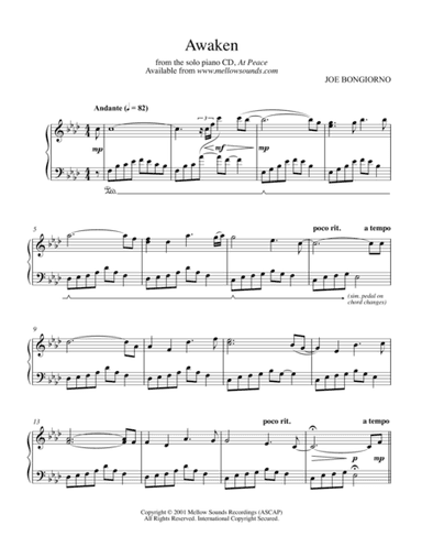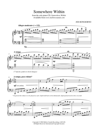 Piano Solo - Level 4 - Digital Download SKU: A0.876712 Composed by Joe Bongiorno. Contemporary. Score. 6 pages. Joe Bongiorno Music #17297. Published by Joe Bongiorno Music (A0.876712). Sheet music instant download of "Somewhere Within" from Joe Bongiorno’s "Somewhere Within" album. Key of G Minor (2 flats) – Level 4 of 5 - early advanced. This product was created by a member of ArrangeMe, Hal Leonard’s global self-publishing community of independent composers, arrangers, and songwriters. ArrangeMe allows for the publication of unique arrangements of both popular titles and original compositions from a wide variety of voices and backgrounds. About Digital Downloads Digital Downloads are downloadable sheet music files that can be viewed directly on your computer, tablet or mobile device. Once you download your digital sheet music, you can view and print it at home, school, or anywhere you want to make music, and you don’t have to be connected to the internet. Just purchase, download and play! PLEASE NOTE: Your Digital Download will have a watermark at the bottom of each page that will include your name, purchase date and number of copies purchased. You are only authorized to print the number of copies that you have purchased. You may not digitally distribute or print more copies than purchased for use (i.e., you may not print or digitally distribute individual copies to friends or students).
