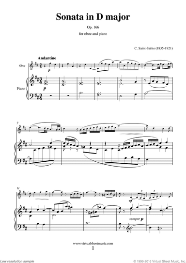 Oboe and Piano SKU: AP.36-M269391 Composed by Camille Saint-Saens. Performance Music Ensemble; Solo Oboe with Piano. Ludwig Masters. Score and Part(s). LudwigMasters Publications #36-M269391. Published by LudwigMasters Publications (AP.36-M269391). ISBN 9781633618084. UPC: 660355008078. English.Camille Saint-Saëns (1835-1921) wrote three sonatas for wind instruments the year that he died, his SONATA FOR OBOE in D Major, Op. 166, being the first. These works were part of the composer's efforts to expand the solo repertoire for less commonly used instruments, writing to a friend, "At the moment I am concentrating my last reserves on giving rarely considered instruments the chance to be heard." The piece is dedicated to Louis Bas, first solo oboe with the Societé du Conservatoire de l'Opéra. These products are currently being prepared by a new publisher. While many items are ready and will ship on time, some others may see delays of several months.