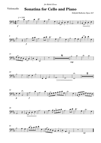 Cello Solo - Level 3 - Digital Download SKU: A0.960767 Composed by Dafydd Bullock. 20th Century,Contemporary. Individual part. 3 pages. Dafydd Bullock #3624455. Published by Dafydd Bullock (A0.960767). Sonatina for Cello and Piano: Cello Part. This product was created by a member of ArrangeMe, Hal Leonard's global self-publishing community of independent composers, arrangers, and songwriters. ArrangeMe allows for the publication of unique arrangements of popular titles and original compositions from a variety of voices and backgrounds. The length, difficulty, and retail pricing are determined solely by the discretion of the person who arranged or composed it. About Digital Downloads Digital Downloads are downloadable sheet music files that can be viewed directly on your computer, tablet or mobile device. Once you download your digital sheet music, you can view and print it at home, school, or anywhere you want to make music, and you don’t have to be connected to the internet. Just purchase, download and play! PLEASE NOTE: Your Digital Download will have a watermark at the bottom of each page that will include your name, purchase date and number of copies purchased. You are only authorized to print the number of copies that you have purchased. You may not digitally distribute or print more copies than purchased for use (i.e., you may not print or digitally distribute individual copies to friends or students).