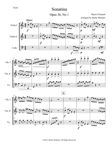 String Trio Cello,Violin - Level 3 - Digital Download SKU: A0.1146472 Composed by Muzio Clementi. Arranged by Sandy McIntire. 19th Century,Chamber,Classical,Instructional,Multicultural,World. 19 pages. Sandy McIntire #746696. Published by Sandy McIntire (A0.1146472). LET'S HAVE FUN WITH CLEMENTI! Muzio Clementi's Sonatina in C Major was a popular assignment for piano students in the last century. Here it is arranged for an INTERMEDIATE STRING TRIO (two violins and cello) in an arrangement for string players that is a lot of fun to play as they trade the melodies and runs back and forth among themselves. A separate sheet for each instrument is included along with the score. Other similar arrangements of familiar pieces arranged by McIntire for string trios include the fiddle tunes, St. Anne's Reel, Flowers of Edinburgh, and Whiskey Before Breakfast, all available at this web site. This product was created by a member of ArrangeMe, Hal Leonard’s global self-publishing community of independent composers, arrangers, and songwriters. ArrangeMe allows for the publication of unique arrangements of both popular titles and original compositions from a wide variety of voices and backgrounds. About Digital Downloads Digital Downloads are downloadable sheet music files that can be viewed directly on your computer, tablet or mobile device. Once you download your digital sheet music, you can view and print it at home, school, or anywhere you want to make music, and you don’t have to be connected to the internet. Just purchase, download and play! PLEASE NOTE: Your Digital Download will have a watermark at the bottom of each page that will include your name, purchase date and number of copies purchased. You are only authorized to print the number of copies that you have purchased. You may not digitally distribute or print more copies than purchased for use (i.e., you may not print or digitally distribute individual copies to friends or students).