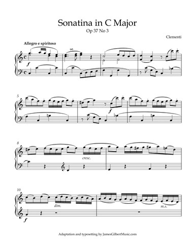 Piano Solo - Digital Download SKU: A0.729212 Composed by Muzio Clementi. Arranged by James Gilbert Music. Classical,Instructional,Standards. Score. 17 pages. James Gilbert Music #6410283. Published by James Gilbert Music (A0.729212). Solo Piano. Sonatina in C Major by Muzio Clementi. Newly typeset and adapted for viewing on tablets and when printed This product was created by a member of ArrangeMe, Hal Leonard's global self-publishing community of independent composers, arrangers, and songwriters. ArrangeMe allows for the publication of unique arrangements of popular titles and original compositions from a variety of voices and backgrounds. The length, difficulty, and retail pricing are determined solely by the discretion of the person who arranged or composed it. About Digital Downloads Digital Downloads are downloadable sheet music files that can be viewed directly on your computer, tablet or mobile device. Once you download your digital sheet music, you can view and print it at home, school, or anywhere you want to make music, and you don’t have to be connected to the internet. Just purchase, download and play! PLEASE NOTE: Your Digital Download will have a watermark at the bottom of each page that will include your name, purchase date and number of copies purchased. You are only authorized to print the number of copies that you have purchased. You may not digitally distribute or print more copies than purchased for use (i.e., you may not print or digitally distribute individual copies to friends or students).