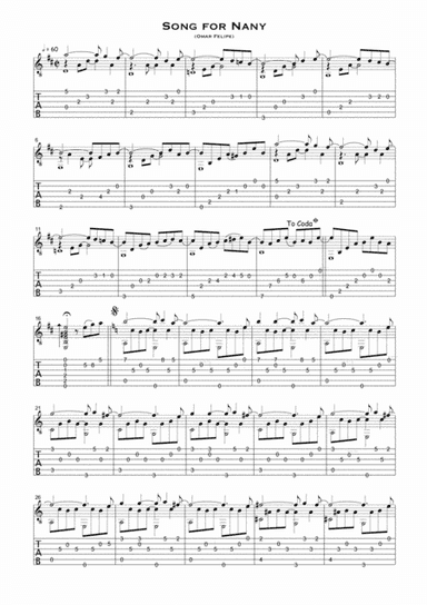 Guitar - Level 4 - Digital Download SKU: A0.922269 Composed by Omar Felipe Merchán. Contemporary. Guitar Tab. 3 pages. Omar Felipe #5952985. Published by Omar Felipe (A0.922269). Song for Nany is a lovely and beautiful piece for solo guitar written in 3 sections. Part 1 and 2 present a very simple melody with a syncopated and repetitive rhythm but with interesting harmonic changes and a certain Brazilian flavor. Part 3 takes advantage of the use of open strings creating a virtuous effect. You will find reminiscences of Jobim, Luiz Bonfá, Baden Powell or Villa-Lobos but also a little jazz and classical music at the same time. This product was created by a member of ArrangeMe, Hal Leonard’s global self-publishing community of independent composers, arrangers, and songwriters. ArrangeMe allows for the publication of unique arrangements of both popular titles and original compositions from a wide variety of voices and backgrounds. About Digital Downloads Digital Downloads are downloadable sheet music files that can be viewed directly on your computer, tablet or mobile device. Once you download your digital sheet music, you can view and print it at home, school, or anywhere you want to make music, and you don’t have to be connected to the internet. Just purchase, download and play! PLEASE NOTE: Your Digital Download will have a watermark at the bottom of each page that will include your name, purchase date and number of copies purchased. You are only authorized to print the number of copies that you have purchased. You may not digitally distribute or print more copies than purchased for use (i.e., you may not print or digitally distribute individual copies to friends or students).