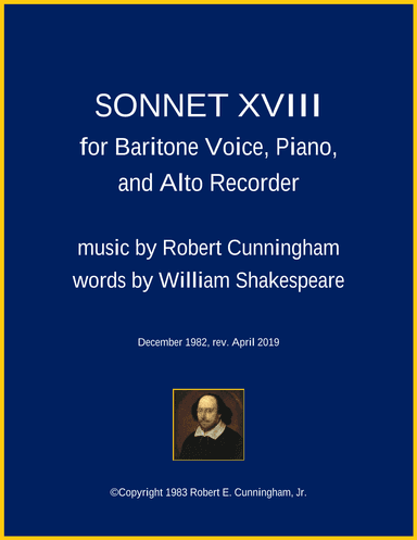 Small Ensemble Piano,Recorder,Voice - Level 5 - Digital Download SKU: A0.1174649 By Robert Cunningham. By Robert E Cunningham. 20th Century,Classical,Contemporary. Score and parts. 21 pages. Robert E Cunningham #774799. Published by Robert E Cunningham (A0.1174649). Robert Cunningham's Sonnet XVIII is a setting of William Shakespeare's Sonnet 18 ("Shall I compare thee to a summer's day?") for baritone voice, piano, and alto recorder. The central idea of Shakespeare's poem is that the otherwise ephemeral beauty of its human subject is immortalized through the artistic medium of the sonnet. This setting takes that idea to the next level by memorializing this sonnet, along with the whole era in which it was penned, through the artistic medium of music. Composed in 1982 and revised in 2019, this work is intensely Romantic, but also has an antique flavor encapsulating the music of Shakespeare's time. The full score and individual parts for the baritone voice and the alto recorder are included. Total duration: 5:40. See also:Robert Cunningham on YouTube: https://www.youtube.com/c/RobertCunninghamsMusicRobert Cunningham on SoundCloud: https://soundcloud.com/lateromanticRobert Cunningham's Fan Page: https://www.facebook.com/RobertCunninghamsMusicRobert Cunningham's Web Page: . This product was created by a member of ArrangeMe, Hal Leonard’s global self-publishing community of independent composers, arrangers, and songwriters. ArrangeMe allows for the publication of unique arrangements of both popular titles and original compositions from a wide variety of voices and backgrounds. About Digital Downloads Digital Downloads are downloadable sheet music files that can be viewed directly on your computer, tablet or mobile device. Once you download your digital sheet music, you can view and print it at home, school, or anywhere you want to make music, and you don’t have to be connected to the internet. Just purchase, download and play! PLEASE NOTE: Your Digital Download will have a watermark at the bottom of each page that will include your name, purchase date and number of copies purchased. You are only authorized to print the number of copies that you have purchased. You may not digitally distribute or print more copies than purchased for use (i.e., you may not print or digitally distribute individual copies to friends or students).