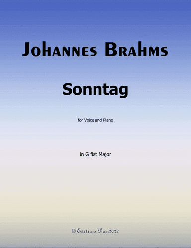 Piano,Vocal,Voice - Level 3 - Digital Download SKU: A0.959858 Composed by Johannes Brahms. Arranged by Editions Dao. Classical,Romantic Period. Score. 6 pages. Editions Dao #6854229. Published by Editions Dao (A0.959858). Sonntag by Brahms, Op.47 No.3, from Five Songs, Op.47, for Voice and Piano.6 Pages. This product was created by a member of ArrangeMe, Hal Leonard's global self-publishing community of independent composers, arrangers, and songwriters. ArrangeMe allows for the publication of unique arrangements of popular titles and original compositions from a variety of voices and backgrounds. The length, difficulty, and retail pricing are determined solely by the discretion of the person who arranged or composed it. About Digital Downloads Digital Downloads are downloadable sheet music files that can be viewed directly on your computer, tablet or mobile device. Once you download your digital sheet music, you can view and print it at home, school, or anywhere you want to make music, and you don’t have to be connected to the internet. Just purchase, download and play! PLEASE NOTE: Your Digital Download will have a watermark at the bottom of each page that will include your name, purchase date and number of copies purchased. You are only authorized to print the number of copies that you have purchased. You may not digitally distribute or print more copies than purchased for use (i.e., you may not print or digitally distribute individual copies to friends or students).