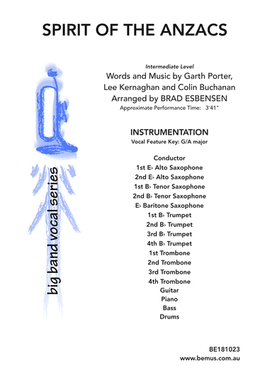 Jazz Ensemble Jazz Ensemble - Level 3 - Digital Download SKU: A0.774373 Composed by Lee Kernaghan. Arranged by Brad Esbensen. Contemporary,Country,Patriotic. 87 pages. Brad Esbensen Music Services #3925535. Published by Brad Esbensen Music Services (A0.774373). A big band arrangement of "Spirit of the Anzacs" in the original key of G major, modulating to A major. The song is based on Paul Keating's 1993 eulogy at the interment of the Unknown Soldier, one of Australia's most iconic speeches. Kernaghan said the song was inspired by Keating's immortal words, "He is all of them. And he is one of us." This particular arrangement was premiered at a special concert commemorating that centenary of Armistice Day on 11 November 2018. The band accompaniment is fairly straight forward and not too demanding of the players. I hope you enjoy performing this chart and if you would like it transposed into another key, please e-mail me at [email protected]. www.bemus.com.au. This product was created by a member of ArrangeMe, Hal Leonard's global self-publishing community of independent composers, arrangers, and songwriters. ArrangeMe allows for the publication of unique arrangements of popular titles and original compositions from a variety of voices and backgrounds. The length, difficulty, and retail pricing are determined solely by the discretion of the person who arranged or composed it. About Digital Downloads Digital Downloads are downloadable sheet music files that can be viewed directly on your computer, tablet or mobile device. Once you download your digital sheet music, you can view and print it at home, school, or anywhere you want to make music, and you don’t have to be connected to the internet. Just purchase, download and play! PLEASE NOTE: Your Digital Download will have a watermark at the bottom of each page that will include your name, purchase date and number of copies purchased. You are only authorized to print the number of copies that you have purchased. You may not digitally distribute or print more copies than purchased for use (i.e., you may not print or digitally distribute individual copies to friends or students).