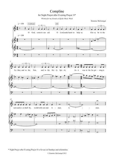Choral Choir,Choral (Unison) - Level 2 - Digital Download SKU: A0.1348744 Composed by Dominic McGonigal. 21st Century,Classical,Contemporary,Religious,Spiritual. 14 pages. C8 Music #933512. Published by C8 Music (A0.1348744). The Spode Compline was written for Spode Music Week, a week of music that started in Spode House. This is a simple setting of the Night Prayer, drawing on the long tradition of liturgical music for the Office Hours. The psalm tones, responses, Nunc Dimittis and Salve Regina are easily readable. The psalmtones have a pleasing flow from verse to verse. The final Marian anthem, Salve Regina, is a particular favourite. Scored for unison voices and organ, the Spode Compline is a pleasure to sing at the end of the day. Scored for Cantor, Congregation. 11'. More at www.dominicmcgonigal.com. This product was created by a member of ArrangeMe, Hal Leonard’s global self-publishing community of independent composers, arrangers, and songwriters. ArrangeMe allows for the publication of unique arrangements of both popular titles and original compositions from a wide variety of voices and backgrounds. About Digital Downloads Digital Downloads are downloadable sheet music files that can be viewed directly on your computer, tablet or mobile device. Once you download your digital sheet music, you can view and print it at home, school, or anywhere you want to make music, and you don’t have to be connected to the internet. Just purchase, download and play! PLEASE NOTE: Your Digital Download will have a watermark at the bottom of each page that will include your name, purchase date and number of copies purchased. You are only authorized to print the number of copies that you have purchased. You may not digitally distribute or print more copies than purchased for use (i.e., you may not print or digitally distribute individual copies to friends or students).