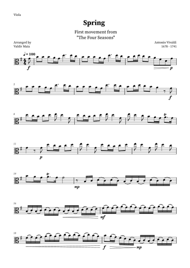 Viola Solo - Level 2 - Digital Download SKU: A0.1176548 Composed by Antonio Vivaldi. Arranged by Valdir Maia. Baroque,Classical,Traditional,Wedding. Individual part. 2 pages. Valdir Maia #776619. Published by Valdir Maia (A0.1176548). Vivaldi Spring sheet music for viola and piano in the key of G major.Unleash Your Musical Talents with Spring Vivaldi Sheet Music.Are you ready to take your music to the next level? Look no further than our collection of Spring Vivaldi viola sheet music. Our selection offers a variety of arrangements, suitable for all skill levels, from beginner to advanced. With clear and easy-to-read notes, our sheet music is perfect for all classical music enthusiasts. Whether you're practicing for a performance or just want to enjoy the beauty of Vivaldi's music, our viola sheet music will help you bring the iconic sound of Spring from The Four Seasons to life. Don't wait, start playing Spring Vivaldi today and immerse yourself in the timeless beauty of classical music. Get your hands on our sheet music now! This product was created by a member of ArrangeMe, Hal Leonard’s global self-publishing community of independent composers, arrangers, and songwriters. ArrangeMe allows for the publication of unique arrangements of both popular titles and original compositions from a wide variety of voices and backgrounds. About Digital Downloads Digital Downloads are downloadable sheet music files that can be viewed directly on your computer, tablet or mobile device. Once you download your digital sheet music, you can view and print it at home, school, or anywhere you want to make music, and you don’t have to be connected to the internet. Just purchase, download and play! PLEASE NOTE: Your Digital Download will have a watermark at the bottom of each page that will include your name, purchase date and number of copies purchased. You are only authorized to print the number of copies that you have purchased. You may not digitally distribute or print more copies than purchased for use (i.e., you may not print or digitally distribute individual copies to friends or students).