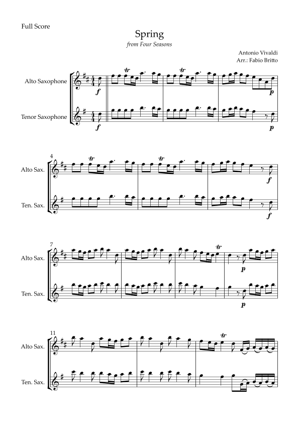 Spring (from Four Seasons of Antonio Vivaldi) for Alto Saxophone & Tenor Saxophone Duo (arr. Fabio Britto)