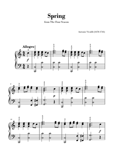 Piano Solo - Level 2 - Digital Download SKU: A0.1162382 Composed by Antonio Vivaldi. Arranged by Gisele Sant'Ana. Baroque,Children,Classical,Holiday,Wedding. Score. 2 pages. Gisele Sant'Ana #762740. Published by Gisele Sant'Ana (A0.1162382). Spring from 'The Four Seasons' - Intermediate piano solo.With bigger notes for better reading. This product was created by a member of ArrangeMe, Hal Leonard's global self-publishing community of independent composers, arrangers, and songwriters. ArrangeMe allows for the publication of unique arrangements of popular titles and original compositions from a variety of voices and backgrounds. The length, difficulty, and retail pricing are determined solely by the discretion of the person who arranged or composed it. About Digital Downloads Digital Downloads are downloadable sheet music files that can be viewed directly on your computer, tablet or mobile device. Once you download your digital sheet music, you can view and print it at home, school, or anywhere you want to make music, and you don’t have to be connected to the internet. Just purchase, download and play! PLEASE NOTE: Your Digital Download will have a watermark at the bottom of each page that will include your name, purchase date and number of copies purchased. You are only authorized to print the number of copies that you have purchased. You may not digitally distribute or print more copies than purchased for use (i.e., you may not print or digitally distribute individual copies to friends or students).