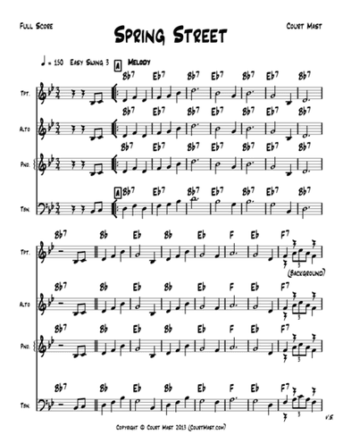 Jazz Combo - Level 3 - Digital Download SKU: A0.800659 Composed by Court Mast. Blues,Instructional,Jazz,Pop. Score and parts. 13 pages. Court Mast #2010881. Published by Court Mast (A0.800659). A moderate-tempo swing waltz in B-flat-concert. Easy changes make this a favorite for beginners. A single PDF file includes concert-pitch Score and transposed parts for Trumpet, Alto Sax, Piano, Trombone. Can be played by any combination of instruments. This product was created by a member of ArrangeMe, Hal Leonard’s global self-publishing community of independent composers, arrangers, and songwriters. ArrangeMe allows for the publication of unique arrangements of both popular titles and original compositions from a wide variety of voices and backgrounds. About Digital Downloads Digital Downloads are downloadable sheet music files that can be viewed directly on your computer, tablet or mobile device. Once you download your digital sheet music, you can view and print it at home, school, or anywhere you want to make music, and you don’t have to be connected to the internet. Just purchase, download and play! PLEASE NOTE: Your Digital Download will have a watermark at the bottom of each page that will include your name, purchase date and number of copies purchased. You are only authorized to print the number of copies that you have purchased. You may not digitally distribute or print more copies than purchased for use (i.e., you may not print or digitally distribute individual copies to friends or students).