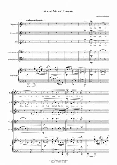 Choral Choir (SSA) - Level 3 - Digital Download SKU: A0.790768 Composed by Maurizio Chiavaroli. Christian,Contemporary,Easter,Standards. Octavo. 9 pages. Maurizio Chiavaroli #6075339. Published by Maurizio Chiavaroli (A0.790768). Composizione sacra originale per coro a voci pari (SSA), 2 violoncelli e pianoforteSacred original composition for choir (SSA), 2 cello and piano. This product was created by a member of ArrangeMe, Hal Leonard's global self-publishing community of independent composers, arrangers, and songwriters. ArrangeMe allows for the publication of unique arrangements of popular titles and original compositions from a variety of voices and backgrounds. The length, difficulty, and retail pricing are determined solely by the discretion of the person who arranged or composed it. About Digital Downloads Digital Downloads are downloadable sheet music files that can be viewed directly on your computer, tablet or mobile device. Once you download your digital sheet music, you can view and print it at home, school, or anywhere you want to make music, and you don’t have to be connected to the internet. Just purchase, download and play! PLEASE NOTE: Your Digital Download will have a watermark at the bottom of each page that will include your name, purchase date and number of copies purchased. You are only authorized to print the number of copies that you have purchased. You may not digitally distribute or print more copies than purchased for use (i.e., you may not print or digitally distribute individual copies to friends or students).
