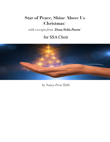 Choral Choir (SSA) - Level 2 - Digital Download SKU: A0.800116 Composed by Nancy Frese Tabb. Children,Christmas,Holiday,Multicultural,Sacred,World. Octavo. 9 pages. Nancy Frese Tabb #6564495. Published by Nancy Frese Tabb (A0.800116). Star of Peace, Shine Above Us, (Christmas version) arranged for a 3 part treble trio (SSA), is a timely seasonal piece. This song proclaims that Jesus' birth brings light into a darkened world and prays for peace. While beginning in unison. Star of Peace, Shine Above Us splits into 3 easy to learn parts during the original refrain. The refrain then evolves into 'Dona Nobis Pacem' adding an extra element and depth to the song. Perfect for an Advent or Christmas service , it can also be used in a holiday recital or concert. This piece is easily accessible and can be learned in just a few rehearsals. This product was created by a member of ArrangeMe, Hal Leonard's global self-publishing community of independent composers, arrangers, and songwriters. ArrangeMe allows for the publication of unique arrangements of popular titles and original compositions from a variety of voices and backgrounds. The length, difficulty, and retail pricing are determined solely by the discretion of the person who arranged or composed it. About Digital Downloads Digital Downloads are downloadable sheet music files that can be viewed directly on your computer, tablet or mobile device. Once you download your digital sheet music, you can view and print it at home, school, or anywhere you want to make music, and you don’t have to be connected to the internet. Just purchase, download and play! PLEASE NOTE: Your Digital Download will have a watermark at the bottom of each page that will include your name, purchase date and number of copies purchased. You are only authorized to print the number of copies that you have purchased. You may not digitally distribute or print more copies than purchased for use (i.e., you may not print or digitally distribute individual copies to friends or students).