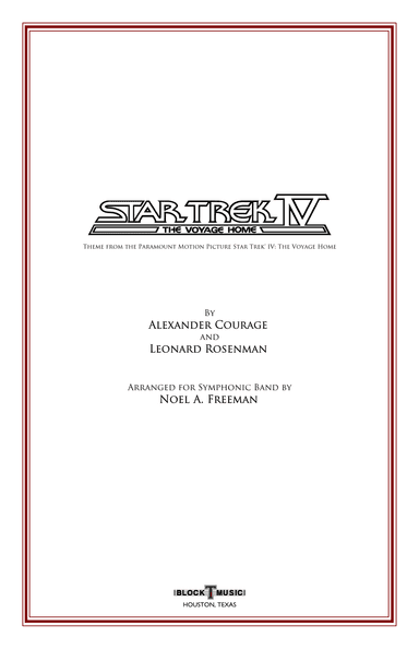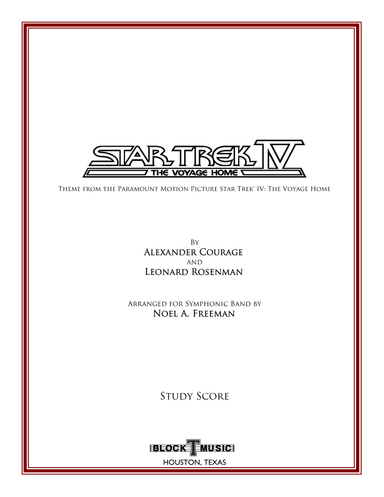 Full Orchestra - Level 4 - Digital Download SKU: A0.1207561 Composed by Alexander Courage and Leonard Rosenman. Arranged by Chris Siddall. Film/TV. 20 pages. Chris Siddall Music Publishing #805729. Published by Chris Siddall Music Publishing (A0.1207561). 1986’s Star Trek IV: The Voyage Home holds a curious place in the original movie run’s pantheon, owing to the fact that it is many Star Trek fan’s least favourite installment in the franchise, whilst being one of the most financially successful. With a more up-beat and comedic tone, after the darker trajectory the previous movies had been taking, and the setting of “modern day” San Francisco, the tonal shift was not only felt on screen but in Leonard Rosenman’s score as well. Originally containing a more complete statement of Alexander Courage’s theme from the original TV series, this revised version of the Main Title is the one heard in the movie. Along with Jerry Goldsmith’s score for Star Trek: The Motion Picture, The Voyage Home is the only other entry in the Star Trek franchise to receive a nomination for the Academy Award for Best Original Score.Created from the original manuscript, this release offers a rare opportunity to study film music in its authentic, original orchestration and arrangement. An opportunity not to be missed! This product was created by a member of ArrangeMe, Hal Leonard’s global self-publishing community of independent composers, arrangers, and songwriters. ArrangeMe allows for the publication of unique arrangements of both popular titles and original compositions from a wide variety of voices and backgrounds. About Digital Downloads Digital Downloads are downloadable sheet music files that can be viewed directly on your computer, tablet or mobile device. Once you download your digital sheet music, you can view and print it at home, school, or anywhere you want to make music, and you don’t have to be connected to the internet. Just purchase, download and play! PLEASE NOTE: Your Digital Download will have a watermark at the bottom of each page that will include your name, purchase date and number of copies purchased. You are only authorized to print the number of copies that you have purchased. You may not digitally distribute or print more copies than purchased for use (i.e., you may not print or digitally distribute individual copies to friends or students).