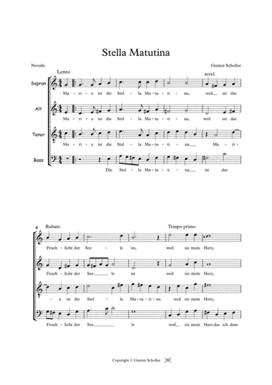 Choral Choir (SATB) - Level 2 - Digital Download SKU: A0.1016070 Composed by Gunter Scholler. 20th Century,A Cappella,Multicultural,Sacred,World. Octavo. 2 pages. Scholler #5296171. Published by Scholler (A0.1016070). The music in this collection does not require any instrumental accompaniment, allowing choirs to showcase their vocal talents and focus solely on creating harmonies with their voices. This simplicity enhances the sense of peacefulness and intimacy in the performances.The sheet music in "Stella Matutina" is inspired by religious traditions, making it suitable for worship services, church concerts, and other spiritual events. The lyrics and melodies reflect the themes of faith, hope, and inner peace, touching the hearts of both performers and listeners.Embrace the transformative power of musicSchollermusic This product was created by a member of ArrangeMe, Hal Leonard's global self-publishing community of independent composers, arrangers, and songwriters. ArrangeMe allows for the publication of unique arrangements of popular titles and original compositions from a variety of voices and backgrounds. The length, difficulty, and retail pricing are determined solely by the discretion of the person who arranged or composed it. About Digital Downloads Digital Downloads are downloadable sheet music files that can be viewed directly on your computer, tablet or mobile device. Once you download your digital sheet music, you can view and print it at home, school, or anywhere you want to make music, and you don’t have to be connected to the internet. Just purchase, download and play! PLEASE NOTE: Your Digital Download will have a watermark at the bottom of each page that will include your name, purchase date and number of copies purchased. You are only authorized to print the number of copies that you have purchased. You may not digitally distribute or print more copies than purchased for use (i.e., you may not print or digitally distribute individual copies to friends or students).
