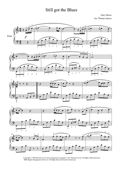 String Quartet String Quartet - Level 4 - Digital Download SKU: A0.1317830 By Gary Moore. By Gary Moore. Arranged by João Jandiroba. Blues,Rock. 16 pages. João Jandiroba #906520. Published by João Jandiroba (A0.1317830). This product was created by a member of ArrangeMe, Hal Leonard’s global self-publishing community of independent composers, arrangers, and songwriters. ArrangeMe allows for the publication of unique arrangements of both popular titles and original compositions from a wide variety of voices and backgrounds. About Digital Downloads Digital Downloads are downloadable sheet music files that can be viewed directly on your computer, tablet or mobile device. Once you download your digital sheet music, you can view and print it at home, school, or anywhere you want to make music, and you don’t have to be connected to the internet. Just purchase, download and play! PLEASE NOTE: Your Digital Download will have a watermark at the bottom of each page that will include your name, purchase date and number of copies purchased. You are only authorized to print the number of copies that you have purchased. You may not digitally distribute or print more copies than purchased for use (i.e., you may not print or digitally distribute individual copies to friends or students).