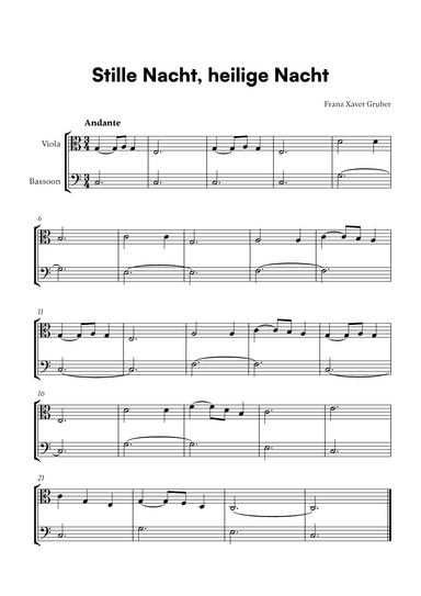 Instrumental Duet - Level 1 - Digital Download SKU: A0.1341202 Composed by Franz Xaver Gruber. Arranged by Cadenza Editions. Christmas. 3 pages. Cadenza Editions #926776. Published by Cadenza Editions (A0.1341202). This product was created by a member of ArrangeMe, Hal Leonard’s global self-publishing community of independent composers, arrangers, and songwriters. ArrangeMe allows for the publication of unique arrangements of both popular titles and original compositions from a wide variety of voices and backgrounds. About Digital Downloads Digital Downloads are downloadable sheet music files that can be viewed directly on your computer, tablet or mobile device. Once you download your digital sheet music, you can view and print it at home, school, or anywhere you want to make music, and you don’t have to be connected to the internet. Just purchase, download and play! PLEASE NOTE: Your Digital Download will have a watermark at the bottom of each page that will include your name, purchase date and number of copies purchased. You are only authorized to print the number of copies that you have purchased. You may not digitally distribute or print more copies than purchased for use (i.e., you may not print or digitally distribute individual copies to friends or students).