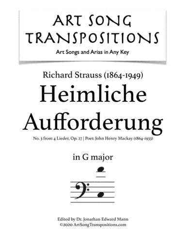 Piano,Vocal,Voice - Digital Download SKU: A0.539567 Composed by Richard Strauss. Arranged by ArtSongTranspositions.com. Romantic Period. Score. 7 pages. AST Publications, LLC #6050193. Published by AST Publications, LLC (A0.539567). ⇨ PAY $0.00 with INSTITUTIONAL MEMBERSHIP✓ 10,000+ art songs and Baroque aria PDFs✓ Transpose sheet music to any key✓ Free for faculty, students, staff, and employees✓ Campus-wide access via IP authentication✓ Off-campus access via EZproxy or SAML This product was created by a member of ArrangeMe, Hal Leonard’s global self-publishing community of independent composers, arrangers, and songwriters. ArrangeMe allows for the publication of unique arrangements of both popular titles and original compositions from a wide variety of voices and backgrounds. About Digital Downloads Digital Downloads are downloadable sheet music files that can be viewed directly on your computer, tablet or mobile device. Once you download your digital sheet music, you can view and print it at home, school, or anywhere you want to make music, and you don’t have to be connected to the internet. Just purchase, download and play! PLEASE NOTE: Your Digital Download will have a watermark at the bottom of each page that will include your name, purchase date and number of copies purchased. You are only authorized to print the number of copies that you have purchased. You may not digitally distribute or print more copies than purchased for use (i.e., you may not print or digitally distribute individual copies to friends or students).