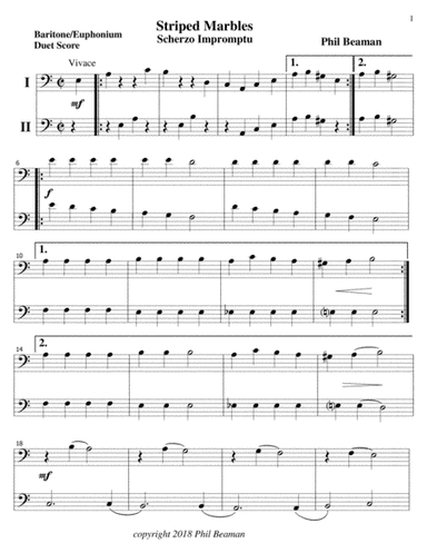 Instrumental Duet Baritone Horn TC,Euphonium,Instrumental Duet - Level 2 - Digital Download SKU: A0.844622 Composed by Phil Beaman. Classical,New Age. Score and parts. 14 pages. Phil Beaman #4364512. Published by Phil Beaman (A0.844622). Two people are playing a spirited games of marbles. The energetic music (Vivace) goes back and forth between the two players. Drama builds. Then an Andante Espressivo section as the victorious player pauses to admire the beauty of the striped marble he has just won. Then Round 2 in the dominant key and another striped marble in the bag. A Recapitulation and a Picardy Third conclude the game with satisfaction.  The notes and rhythms are quite easy. (Some might find a slight challenge in the 1 1/2 octave range or the quick tempo).   The interest comes from the contrasting sections; energy vs espressivo, vivace vs andante, detached vs slurred.  This piece is fun to play and very showy for concert.84 bars; 2 minutes; 3 page score; 2 page partNB. Score and parts are provided in both Bass and Treble ClefTemporary recording of piano reduction of score. This product was created by a member of ArrangeMe, Hal Leonard’s global self-publishing community of independent composers, arrangers, and songwriters. ArrangeMe allows for the publication of unique arrangements of both popular titles and original compositions from a wide variety of voices and backgrounds. About Digital Downloads Digital Downloads are downloadable sheet music files that can be viewed directly on your computer, tablet or mobile device. Once you download your digital sheet music, you can view and print it at home, school, or anywhere you want to make music, and you don’t have to be connected to the internet. Just purchase, download and play! PLEASE NOTE: Your Digital Download will have a watermark at the bottom of each page that will include your name, purchase date and number of copies purchased. You are only authorized to print the number of copies that you have purchased. You may not digitally distribute or print more copies than purchased for use (i.e., you may not print or digitally distribute individual copies to friends or students).