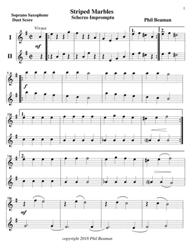 Soprano Saxophone Duet Soprano Saxophone - Level 2 - Digital Download SKU: A0.844611 Composed by Phil Beaman. Classical,New Age. Score. 7 pages. Phil Beaman #4363353. Published by Phil Beaman (A0.844611). Two people are playing a spirited games of marbles. The energetic music (Vivace) goes back and forth between the two players. Drama builds. Then an Andante Espressivo section as the victorious player pauses to admire the beauty of the striped marble he has just won. Then Round 2 in the dominant key and another striped marble in the bag. A Recapitulation and a Picardy Third conclude the game with satisfaction.  The notes and rhythms are quite easy. (Some might find a slight challenge in the 1 1/2 octave range or the quick tempo).   The interest comes from the contrasting sections; energy vs espressivo, vivace vs andante, detached vs slurred.  This piece is fun to play and very showy for concert.84 bars; 2 minutes; 3 page score; 2 page partTemporary recording of piano reduction of score. This product was created by a member of ArrangeMe, Hal Leonard’s global self-publishing community of independent composers, arrangers, and songwriters. ArrangeMe allows for the publication of unique arrangements of both popular titles and original compositions from a wide variety of voices and backgrounds. About Digital Downloads Digital Downloads are downloadable sheet music files that can be viewed directly on your computer, tablet or mobile device. Once you download your digital sheet music, you can view and print it at home, school, or anywhere you want to make music, and you don’t have to be connected to the internet. Just purchase, download and play! PLEASE NOTE: Your Digital Download will have a watermark at the bottom of each page that will include your name, purchase date and number of copies purchased. You are only authorized to print the number of copies that you have purchased. You may not digitally distribute or print more copies than purchased for use (i.e., you may not print or digitally distribute individual copies to friends or students).