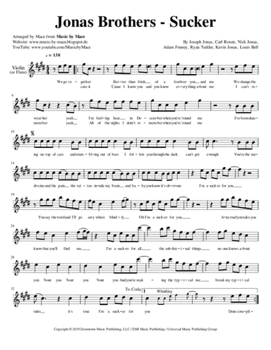 Bass Guitar,Drum Set,Electric Guitar,Keyboard,Vibraphone - Digital Download SKU: A0.1358078 By Jonas Brothers. By Adam Feeney, Homer Steinweiss, Joseph Jonas, Kevin Jonas, Louis Bell, Miles Ale, Mustafa Ahmed, Nick Jonas, and Ryan Tedder. Arranged by David E. Clark. Pop,Rock. 25 pages. David E. Clark #942586. Published by David E. Clark (A0.1358078). "Sucker" for contemporary band...just add vocals!Parts included:ScoreBass (with Tabs)DrumsGuitar 1 (with Tabs)Guitar 2 (with Tabs)KeyboardVibraphone. This product was created by a member of ArrangeMe, Hal Leonard’s global self-publishing community of independent composers, arrangers, and songwriters. ArrangeMe allows for the publication of unique arrangements of both popular titles and original compositions from a wide variety of voices and backgrounds. About Digital Downloads Digital Downloads are downloadable sheet music files that can be viewed directly on your computer, tablet or mobile device. Once you download your digital sheet music, you can view and print it at home, school, or anywhere you want to make music, and you don’t have to be connected to the internet. Just purchase, download and play! PLEASE NOTE: Your Digital Download will have a watermark at the bottom of each page that will include your name, purchase date and number of copies purchased. You are only authorized to print the number of copies that you have purchased. You may not digitally distribute or print more copies than purchased for use (i.e., you may not print or digitally distribute individual copies to friends or students).