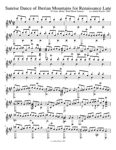 Solo Guitar - Level 3 - Digital Download SKU: A0.1173656 By Andrei Krylov. By Andrei Krylov. Arranged by Andrei Krylov. Medieval,New Age,Renaissance. Individual part. 2 pages. Andrei Krylov #773803. Published by Andrei Krylov (A0.1173656). Sunrise Dance of Iberian Mountains for Renaissance Lute (or classical guitar). This product was created by a member of ArrangeMe, Hal Leonard's global self-publishing community of independent composers, arrangers, and songwriters. ArrangeMe allows for the publication of unique arrangements of popular titles and original compositions from a variety of voices and backgrounds. The length, difficulty, and retail pricing are determined solely by the discretion of the person who arranged or composed it. About Digital Downloads Digital Downloads are downloadable sheet music files that can be viewed directly on your computer, tablet or mobile device. Once you download your digital sheet music, you can view and print it at home, school, or anywhere you want to make music, and you don’t have to be connected to the internet. Just purchase, download and play! PLEASE NOTE: Your Digital Download will have a watermark at the bottom of each page that will include your name, purchase date and number of copies purchased. You are only authorized to print the number of copies that you have purchased. You may not digitally distribute or print more copies than purchased for use (i.e., you may not print or digitally distribute individual copies to friends or students).