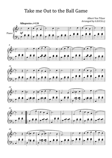 Easy Piano - Level 1 - Digital Download SKU: A0.1075943 By Albert Von Tilzer. By Albert Von Tilzer. Arranged by GDVSLJ. Children,Classical,Traditional. Score. 2 pages. GDJ #680114. Published by GDJ (A0.1075943). It's an easy piano arrangement for beginners. This product was created by a member of ArrangeMe, Hal Leonard's global self-publishing community of independent composers, arrangers, and songwriters. ArrangeMe allows for the publication of unique arrangements of popular titles and original compositions from a variety of voices and backgrounds. The length, difficulty, and retail pricing are determined solely by the discretion of the person who arranged or composed it. About Digital Downloads Digital Downloads are downloadable sheet music files that can be viewed directly on your computer, tablet or mobile device. Once you download your digital sheet music, you can view and print it at home, school, or anywhere you want to make music, and you don’t have to be connected to the internet. Just purchase, download and play! PLEASE NOTE: Your Digital Download will have a watermark at the bottom of each page that will include your name, purchase date and number of copies purchased. You are only authorized to print the number of copies that you have purchased. You may not digitally distribute or print more copies than purchased for use (i.e., you may not print or digitally distribute individual copies to friends or students).