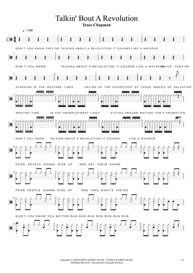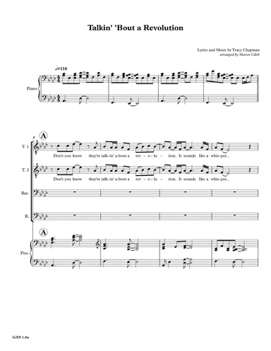 Choral Choir (TTBB) - Level 3 - Digital Download SKU: A0.996706 By Tracy Chapman. By Tracy Chapman. Arranged by Adriel D. Reynolds. Contemporary. Octavo. 12 pages. Adriel D. Reynolds #5022117. Published by Adriel D. Reynolds (A0.996706). "Talkin' 'Bout a Revolution" is a hit protest song by Tracy Chapman, here arranged for TTBB chorus. The simple piano part can be easily augmented by drum and bass guitar, and the opportunities for sections to show their stuff are easily utilized. This product was created by a member of ArrangeMe, Hal Leonard’s global self-publishing community of independent composers, arrangers, and songwriters. ArrangeMe allows for the publication of unique arrangements of both popular titles and original compositions from a wide variety of voices and backgrounds. About Digital Downloads Digital Downloads are downloadable sheet music files that can be viewed directly on your computer, tablet or mobile device. Once you download your digital sheet music, you can view and print it at home, school, or anywhere you want to make music, and you don’t have to be connected to the internet. Just purchase, download and play! PLEASE NOTE: Your Digital Download will have a watermark at the bottom of each page that will include your name, purchase date and number of copies purchased. You are only authorized to print the number of copies that you have purchased. You may not digitally distribute or print more copies than purchased for use (i.e., you may not print or digitally distribute individual copies to friends or students).
