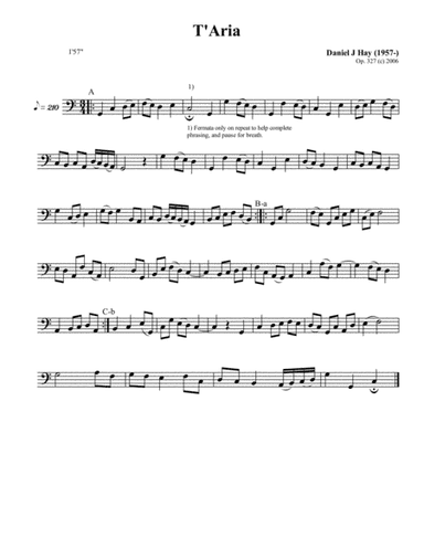 Cello Solo - Level 3 - Digital Download SKU: A0.596443 Composed by Daniel Hay. Classical,Contemporary,Multicultural,World. Individual part. 1 pages. Daniel Hay Music #5808665. Published by Daniel Hay Music (A0.596443). This bass clef solo was created for a special friend, hence the title T'Aria is a "song for T". The attached YouTube video is of a practice session in the Washington mountains outside the hand-built cabin the composer, Daniel Hay, made and lived in for three years. Note that the instrument played is a Moeck "Tuju" Tenor Recorder so is not really a bass clef instrument but the composer's bass was lost during Hurricane Katrina. The sound sample is voiced in Cello. Good piece for Cello or Bassoon. This product was created by a member of ArrangeMe, Hal Leonard's global self-publishing community of independent composers, arrangers, and songwriters. ArrangeMe allows for the publication of unique arrangements of popular titles and original compositions from a variety of voices and backgrounds. The length, difficulty, and retail pricing are determined solely by the discretion of the person who arranged or composed it. About Digital Downloads Digital Downloads are downloadable sheet music files that can be viewed directly on your computer, tablet or mobile device. Once you download your digital sheet music, you can view and print it at home, school, or anywhere you want to make music, and you don’t have to be connected to the internet. Just purchase, download and play! PLEASE NOTE: Your Digital Download will have a watermark at the bottom of each page that will include your name, purchase date and number of copies purchased. You are only authorized to print the number of copies that you have purchased. You may not digitally distribute or print more copies than purchased for use (i.e., you may not print or digitally distribute individual copies to friends or students).