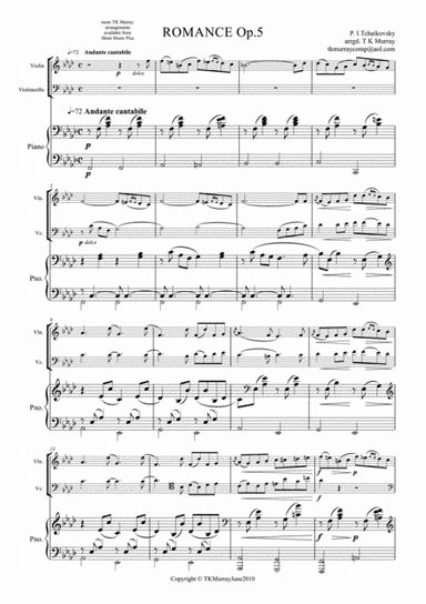 Piano Trio,String Ensemble - Level 3 - Digital Download SKU: A0.824002 Composed by Peter Ilyich Tchaikovsky. Arranged by Tim TK Murray. Concert,Romantic Period. Score and parts. 13 pages. TK (Tim) Murray #4783863. Published by TK (Tim) Murray (A0.824002). The Romance Op.5 is pure Tchaikovsky at his most Romantic - Lyrical, Passionate & very Dramatic! It is a beautiful work and lends itself very successfully to Piano Trio as the interaction of the instruments really heightens the emotions.Highly recommended. Originally from Glasgow, Timothy studied at the Royal College of Music, London and the Banff Centre, Canada. He was the Pianist for the Isis Piano Trio and Ballet Creations and is now in demand as an accompanist and chamber musician having performed with artists such as Dame Sarah Connolly and Tasmin Little. He has toured widely internationally and has recorded for BBC Radio 3 and Classic FM as well as TV appearances in Russia and Egypt. Murray’s compositions have been recorded by The Fibbonnaci Sequence and Piers Lane among others with reviews such as ‘Corruscating’ (Independent) and ‘Highly imaginative’ (The Sunday Times). Contact; [email protected] This product was created by a member of ArrangeMe, Hal Leonard's global self-publishing community of independent composers, arrangers, and songwriters. ArrangeMe allows for the publication of unique arrangements of popular titles and original compositions from a variety of voices and backgrounds. The length, difficulty, and retail pricing are determined solely by the discretion of the person who arranged or composed it. About Digital Downloads Digital Downloads are downloadable sheet music files that can be viewed directly on your computer, tablet or mobile device. Once you download your digital sheet music, you can view and print it at home, school, or anywhere you want to make music, and you don’t have to be connected to the internet. Just purchase, download and play! PLEASE NOTE: Your Digital Download will have a watermark at the bottom of each page that will include your name, purchase date and number of copies purchased. You are only authorized to print the number of copies that you have purchased. You may not digitally distribute or print more copies than purchased for use (i.e., you may not print or digitally distribute individual copies to friends or students).