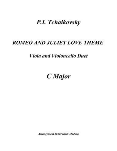 Instrumental Duet Cello,Instrumental Duet,Viola - Level 3 - Digital Download SKU: A0.715612 Composed by P. I. Tchaikovsky. Arranged by Abraham Maduro. Classical,Holiday,Romantic Period,Standards,Wedding. Score and parts. 8 pages. Abraham Maduro #5318731. Published by Abraham Maduro (A0.715612). Romeo y Julieta Viola cello duetViola and Violoncello Duet Arrangement of the Tchaikovsky's Romeo and Juliet Love Theme, in this piece the original melody is mainly played for the Violin part but in some ponits the cello takes the lead and both parts are musical and interesting along the entire piece, intermediate level, 4 minutes long approximately, C major, special for weddings, recitals, concerts, events or just for have fun playing ant home.For more arrangements https://www.sheetmusicplus.com/publishers/abraham-maduro/6638?aff_id=627655You can contact me [email protected] This product was created by a member of ArrangeMe, Hal Leonard's global self-publishing community of independent composers, arrangers, and songwriters. ArrangeMe allows for the publication of unique arrangements of popular titles and original compositions from a variety of voices and backgrounds. The length, difficulty, and retail pricing are determined solely by the discretion of the person who arranged or composed it. About Digital Downloads Digital Downloads are downloadable sheet music files that can be viewed directly on your computer, tablet or mobile device. Once you download your digital sheet music, you can view and print it at home, school, or anywhere you want to make music, and you don’t have to be connected to the internet. Just purchase, download and play! PLEASE NOTE: Your Digital Download will have a watermark at the bottom of each page that will include your name, purchase date and number of copies purchased. You are only authorized to print the number of copies that you have purchased. You may not digitally distribute or print more copies than purchased for use (i.e., you may not print or digitally distribute individual copies to friends or students).