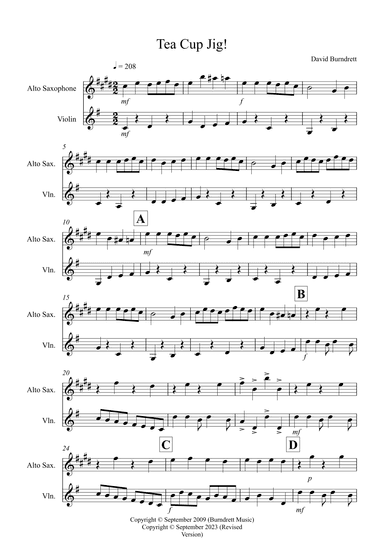 Alto Saxophone,Instrumental Duet,Violin - Level 1 - Digital Download SKU: A0.1349115 Composed by David Burndrett. Contemporary. 5 pages. David Burndrett #933855. Published by David Burndrett (A0.1349115). This works well as a concert piece or just for fun!Each instrument gets the tune.Download includes the score and both of the parts. This product was created by a member of ArrangeMe, Hal Leonard’s global self-publishing community of independent composers, arrangers, and songwriters. ArrangeMe allows for the publication of unique arrangements of both popular titles and original compositions from a wide variety of voices and backgrounds. About Digital Downloads Digital Downloads are downloadable sheet music files that can be viewed directly on your computer, tablet or mobile device. Once you download your digital sheet music, you can view and print it at home, school, or anywhere you want to make music, and you don’t have to be connected to the internet. Just purchase, download and play! PLEASE NOTE: Your Digital Download will have a watermark at the bottom of each page that will include your name, purchase date and number of copies purchased. You are only authorized to print the number of copies that you have purchased. You may not digitally distribute or print more copies than purchased for use (i.e., you may not print or digitally distribute individual copies to friends or students).