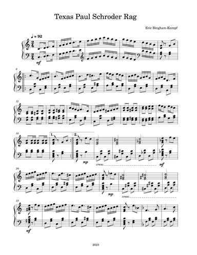 Piano Solo - Level 3 - Digital Download SKU: A0.1217371 Composed by Eric Bingham-Kumpf. Ragtime. Score. 2 pages. Eric Bingham-Kumpf #813915. Published by Eric Bingham-Kumpf (A0.1217371). This product was created by a member of ArrangeMe, Hal Leonard's global self-publishing community of independent composers, arrangers, and songwriters. ArrangeMe allows for the publication of unique arrangements of popular titles and original compositions from a variety of voices and backgrounds. The length, difficulty, and retail pricing are determined solely by the discretion of the person who arranged or composed it. About Digital Downloads Digital Downloads are downloadable sheet music files that can be viewed directly on your computer, tablet or mobile device. Once you download your digital sheet music, you can view and print it at home, school, or anywhere you want to make music, and you don’t have to be connected to the internet. Just purchase, download and play! PLEASE NOTE: Your Digital Download will have a watermark at the bottom of each page that will include your name, purchase date and number of copies purchased. You are only authorized to print the number of copies that you have purchased. You may not digitally distribute or print more copies than purchased for use (i.e., you may not print or digitally distribute individual copies to friends or students).