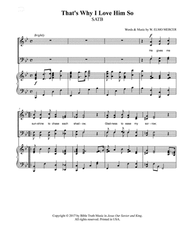 Choral Choir (SATB) - Level 3 - Digital Download SKU: A0.770917 Composed by W. Elmo Mercer. Christian,Gospel. Octavo. 5 pages. Bible Truth Music #4301271. Published by Bible Truth Music (A0.770917). A reflective arrangement recalling the reasons why we love our Savior and Redeemer! This product was created by a member of ArrangeMe, Hal Leonard’s global self-publishing community of independent composers, arrangers, and songwriters. ArrangeMe allows for the publication of unique arrangements of both popular titles and original compositions from a wide variety of voices and backgrounds. About Digital Downloads Digital Downloads are downloadable sheet music files that can be viewed directly on your computer, tablet or mobile device. Once you download your digital sheet music, you can view and print it at home, school, or anywhere you want to make music, and you don’t have to be connected to the internet. Just purchase, download and play! PLEASE NOTE: Your Digital Download will have a watermark at the bottom of each page that will include your name, purchase date and number of copies purchased. You are only authorized to print the number of copies that you have purchased. You may not digitally distribute or print more copies than purchased for use (i.e., you may not print or digitally distribute individual copies to friends or students).