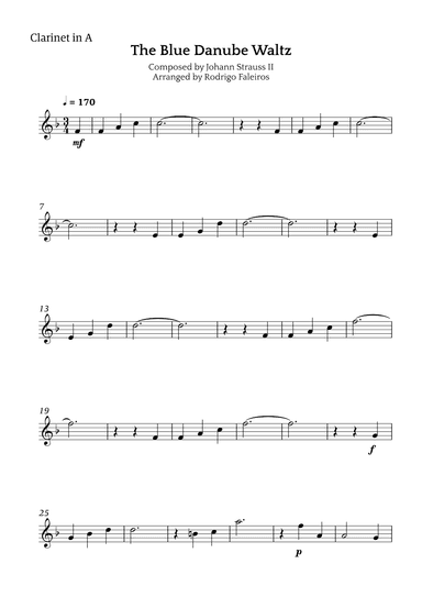 B-Flat Clarinet Solo - Level 3 - Digital Download SKU: A0.1282204 Composed by Johann Strauss Jr. Arranged by B. C. Dockery. 19th Century,Children,Classical,Film/TV,Romantic Period. Individual part. 2 pages. Ben Dockery #873511. Published by Ben Dockery (A0.1282204). Austrian composer Johann Strauss Jr.'s famous waltz "An der schönen blauen Donau," aka The Blue Danube: arranged for solo B-flat clarinet. Great for lessons, recitals, and performances of all kinds. Intermediate level. This product was created by a member of ArrangeMe, Hal Leonard's global self-publishing community of independent composers, arrangers, and songwriters. ArrangeMe allows for the publication of unique arrangements of popular titles and original compositions from a variety of voices and backgrounds. The length, difficulty, and retail pricing are determined solely by the discretion of the person who arranged or composed it. About Digital Downloads Digital Downloads are downloadable sheet music files that can be viewed directly on your computer, tablet or mobile device. Once you download your digital sheet music, you can view and print it at home, school, or anywhere you want to make music, and you don’t have to be connected to the internet. Just purchase, download and play! PLEASE NOTE: Your Digital Download will have a watermark at the bottom of each page that will include your name, purchase date and number of copies purchased. You are only authorized to print the number of copies that you have purchased. You may not digitally distribute or print more copies than purchased for use (i.e., you may not print or digitally distribute individual copies to friends or students).