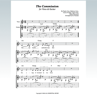 Small Ensemble Guitar,Piano,Vocal,Voice - Level 2 - Digital Download SKU: A0.586235 By CAIN. By Blake Neesmith, Carter Frodge, Logan Cain, Madison Cain, and Taylor Cain. Arranged by Jeff Tincher. Contemporary. Score. 8 pages. Jeff Tincher #6659999. Published by Jeff Tincher (A0.586235). Here is a beautiful Contemporary Christian ballad by Cain. In the original key from their single. Duration = 3:11. Visit my websites: https://jefftincher.wixsite.com/sheetmusic, https://jefftincher.wixsite.com/music, https://www.facebook.com/jefftincherpublishing. This product was created by a member of ArrangeMe, Hal Leonard's global self-publishing community of independent composers, arrangers, and songwriters. ArrangeMe allows for the publication of unique arrangements of popular titles and original compositions from a variety of voices and backgrounds. The length, difficulty, and retail pricing are determined solely by the discretion of the person who arranged or composed it. About Digital Downloads Digital Downloads are downloadable sheet music files that can be viewed directly on your computer, tablet or mobile device. Once you download your digital sheet music, you can view and print it at home, school, or anywhere you want to make music, and you don’t have to be connected to the internet. Just purchase, download and play! PLEASE NOTE: Your Digital Download will have a watermark at the bottom of each page that will include your name, purchase date and number of copies purchased. You are only authorized to print the number of copies that you have purchased. You may not digitally distribute or print more copies than purchased for use (i.e., you may not print or digitally distribute individual copies to friends or students).