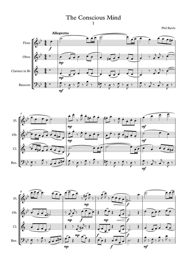 Flute Quartet,Woodwind Ensemble Alto Flute,Piccolo - Level 3 - Digital Download SKU: A0.1317840 Composed by Phil Rawle. Chamber,Classical,Contemporary. 46 pages. Phillip Rawle #906532. Published by Phillip Rawle (A0.1317840). The Conscious Mind - Flute Quartet.A modern piece for Wind quartet - Piccolo, Flute 1, Flute 2, Alto Flute.This work has three short movements -I - Allegretto II - Moderato III - Allegro(The audio clip is Movement I). This product was created by a member of ArrangeMe, Hal Leonard's global self-publishing community of independent composers, arrangers, and songwriters. ArrangeMe allows for the publication of unique arrangements of popular titles and original compositions from a variety of voices and backgrounds. The length, difficulty, and retail pricing are determined solely by the discretion of the person who arranged or composed it. About Digital Downloads Digital Downloads are downloadable sheet music files that can be viewed directly on your computer, tablet or mobile device. Once you download your digital sheet music, you can view and print it at home, school, or anywhere you want to make music, and you don’t have to be connected to the internet. Just purchase, download and play! PLEASE NOTE: Your Digital Download will have a watermark at the bottom of each page that will include your name, purchase date and number of copies purchased. You are only authorized to print the number of copies that you have purchased. You may not digitally distribute or print more copies than purchased for use (i.e., you may not print or digitally distribute individual copies to friends or students).