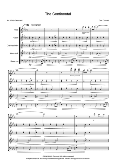 Woodwind Ensemble,Woodwind Quintet Bassoon,Clarinet,Flute,Oboe - Level 4 - Digital Download SKU: A0.852637 Composed by Con Conrad. Arranged by Keith Gemmell. 20th Century,Broadway,Jazz,Wedding. 26 pages. Keith Gemmell #2016173. Published by Keith Gemmell (A0.852637). Add a dash of 1930s panache and sophistication to your Wind Quintet repertoire with this famous Academy Award winning tune. The piece was first arranged for the Pasadena Roof Orchestra in 1995. Since then it has had numerous performances and broadcasts. As well as being a great lighthearted arrangement for concerts it's also suitable for weddings. This product was created by a member of ArrangeMe, Hal Leonard's global self-publishing community of independent composers, arrangers, and songwriters. ArrangeMe allows for the publication of unique arrangements of popular titles and original compositions from a variety of voices and backgrounds. The length, difficulty, and retail pricing are determined solely by the discretion of the person who arranged or composed it. About Digital Downloads Digital Downloads are downloadable sheet music files that can be viewed directly on your computer, tablet or mobile device. Once you download your digital sheet music, you can view and print it at home, school, or anywhere you want to make music, and you don’t have to be connected to the internet. Just purchase, download and play! PLEASE NOTE: Your Digital Download will have a watermark at the bottom of each page that will include your name, purchase date and number of copies purchased. You are only authorized to print the number of copies that you have purchased. You may not digitally distribute or print more copies than purchased for use (i.e., you may not print or digitally distribute individual copies to friends or students).