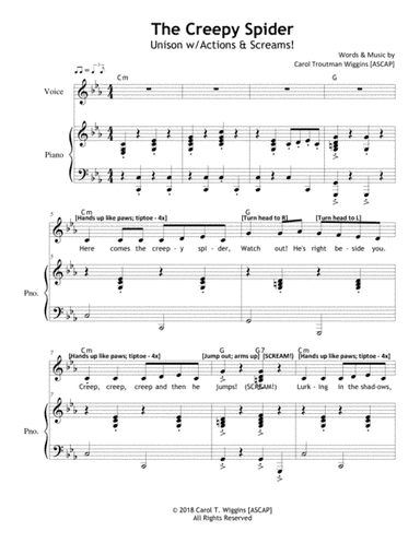 Choral Choir (Unison) - Level 1 - Digital Download SKU: A0.727433 Composed by Carol Troutman Wiggins. Children,Folk,Holiday,Instructional,Thriller. Octavo. 5 pages. Carol Troutman Wiggins #3626561. Published by Carol Troutman Wiggins (A0.727433). THE CREEPY SPIDERUnison w/Actions & Screams!This is a great song for Halloween or any other time you need a break from the norm - a fun song to allow your students to "let their hair down!" Yes, it has screams in it, but they are short screams. Or not! Excellent for any age elementary or a fun warm-up for younger middle schoolIncludes action cues in scoreJumps and screams - not a scary song . . . just creepy!Chords included for additional instrumentsPiano Accompaniment track available on this site. This product was created by a member of ArrangeMe, Hal Leonard’s global self-publishing community of independent composers, arrangers, and songwriters. ArrangeMe allows for the publication of unique arrangements of both popular titles and original compositions from a wide variety of voices and backgrounds. About Digital Downloads Digital Downloads are downloadable sheet music files that can be viewed directly on your computer, tablet or mobile device. Once you download your digital sheet music, you can view and print it at home, school, or anywhere you want to make music, and you don’t have to be connected to the internet. Just purchase, download and play! PLEASE NOTE: Your Digital Download will have a watermark at the bottom of each page that will include your name, purchase date and number of copies purchased. You are only authorized to print the number of copies that you have purchased. You may not digitally distribute or print more copies than purchased for use (i.e., you may not print or digitally distribute individual copies to friends or students).