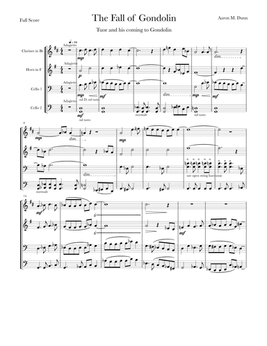 Cello,Clarinet,Double Bass,Horn,Trombone - Level 4 - Digital Download SKU: A0.1308825 By Aaron Dunn. By Aaron Dunn. Film/TV,Video Game. 15 pages. Aaron Dunn #898072. Published by Aaron Dunn (A0.1308825). Movement I of The Fall of Gondolin for Quartet. This product was created by a member of ArrangeMe, Hal Leonard’s global self-publishing community of independent composers, arrangers, and songwriters. ArrangeMe allows for the publication of unique arrangements of both popular titles and original compositions from a wide variety of voices and backgrounds. About Digital Downloads Digital Downloads are downloadable sheet music files that can be viewed directly on your computer, tablet or mobile device. Once you download your digital sheet music, you can view and print it at home, school, or anywhere you want to make music, and you don’t have to be connected to the internet. Just purchase, download and play! PLEASE NOTE: Your Digital Download will have a watermark at the bottom of each page that will include your name, purchase date and number of copies purchased. You are only authorized to print the number of copies that you have purchased. You may not digitally distribute or print more copies than purchased for use (i.e., you may not print or digitally distribute individual copies to friends or students).