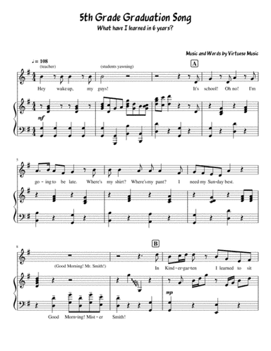 Choral Choir (Mixed) - Level 2 - Digital Download SKU: A0.1015932 Composed by Virtuoso Music. Arranged by Virtuoso Music. Children,Graduation,Instructional. Octavo. 12 pages. Virtuoso Music #5022547. Published by Virtuoso Music (A0.1015932). Everything the kids have learned in the past 6 years.  A song to dedicate in lower school (elementary) graduation or for 5th grade voice/choir.  Make fun and fond memories.  . This product was created by a member of ArrangeMe, Hal Leonard’s global self-publishing community of independent composers, arrangers, and songwriters. ArrangeMe allows for the publication of unique arrangements of both popular titles and original compositions from a wide variety of voices and backgrounds. About Digital Downloads Digital Downloads are downloadable sheet music files that can be viewed directly on your computer, tablet or mobile device. Once you download your digital sheet music, you can view and print it at home, school, or anywhere you want to make music, and you don’t have to be connected to the internet. Just purchase, download and play! PLEASE NOTE: Your Digital Download will have a watermark at the bottom of each page that will include your name, purchase date and number of copies purchased. You are only authorized to print the number of copies that you have purchased. You may not digitally distribute or print more copies than purchased for use (i.e., you may not print or digitally distribute individual copies to friends or students).