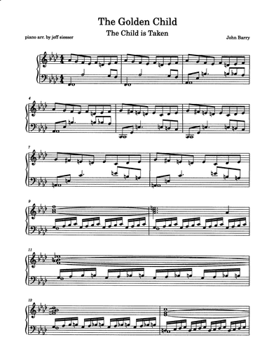 Piano Solo - Level 3 - Digital Download SKU: A0.1279995 Composed by John Barry. Arranged by Jeff Siesser. Film/TV. Score. 2 pages. Mercenary Publications #871414. Published by Mercenary Publications (A0.1279995). This is my piano solo arrangement of (an excerpt from) John Barry's mysterious "The Child is Taken" theme from his (rejected) score from the 1986 film "The Golden Child" starring Eddie Murphy This product was created by a member of ArrangeMe, Hal Leonard’s global self-publishing community of independent composers, arrangers, and songwriters. ArrangeMe allows for the publication of unique arrangements of both popular titles and original compositions from a wide variety of voices and backgrounds. About Digital Downloads Digital Downloads are downloadable sheet music files that can be viewed directly on your computer, tablet or mobile device. Once you download your digital sheet music, you can view and print it at home, school, or anywhere you want to make music, and you don’t have to be connected to the internet. Just purchase, download and play! PLEASE NOTE: Your Digital Download will have a watermark at the bottom of each page that will include your name, purchase date and number of copies purchased. You are only authorized to print the number of copies that you have purchased. You may not digitally distribute or print more copies than purchased for use (i.e., you may not print or digitally distribute individual copies to friends or students).