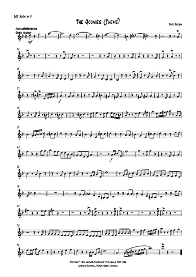Horn - Level 5 - Digital Download SKU: A0.1314325 By Dave Grusin. By Dave Grusin. Arranged by Steve Herbert. Film/TV. 5 pages. Steve Herbert #903057. Published by Steve Herbert (A0.1314325). The Goonies theme.Great upbeat version of the popular theme from the film arranged for 5 French horns. This product was created by a member of ArrangeMe, Hal Leonard’s global self-publishing community of independent composers, arrangers, and songwriters. ArrangeMe allows for the publication of unique arrangements of both popular titles and original compositions from a wide variety of voices and backgrounds. About Digital Downloads Digital Downloads are downloadable sheet music files that can be viewed directly on your computer, tablet or mobile device. Once you download your digital sheet music, you can view and print it at home, school, or anywhere you want to make music, and you don’t have to be connected to the internet. Just purchase, download and play! PLEASE NOTE: Your Digital Download will have a watermark at the bottom of each page that will include your name, purchase date and number of copies purchased. You are only authorized to print the number of copies that you have purchased. You may not digitally distribute or print more copies than purchased for use (i.e., you may not print or digitally distribute individual copies to friends or students).