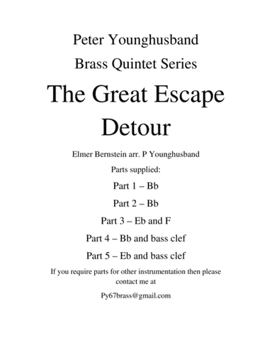 Baritone Horn TC,E-Flat Cornet,Euphonium,Flugelhorn,Trombone,Trumpet,Tuba - Level 3 - Digital Download SKU: A0.1326115 Composed by Al Stillman and Elmer Bernstein. Arranged by Kevin P Holdgate. 20th Century,Broadway,Film/TV,Musical/Show. 15 pages. Kevin P Holdgate #914315. Published by Kevin P Holdgate (A0.1326115). The Great Escape is a 1963 American epic war suspense adventure film starring Steve McQueen, James Garner and Richard Attenborough and featuring James Donald, Charles Bronson, Donald Pleasence, James Coburn, Hannes Messemer, David McCallum, Gordon Jackson, John Leyton and Angus Lennie. It was filmed in Panavision, and its musical score was composed by Elmer Bernstein.Based on Paul Brickhill's 1950 non-fiction book of the same name, the film depicts a heavily fictionalized version of the mass escape by British Commonwealth prisoners of war from German POW camp Stalag Luft III during the Second World War. The film made numerous compromises for its commercial appeal, including its portrayal of American prisoners' involvement in the escape.This arrangement for brass quartet (with parts for Eb & Bb Instruments) always goes down well with audiences. This product was created by a member of ArrangeMe, Hal Leonard’s global self-publishing community of independent composers, arrangers, and songwriters. ArrangeMe allows for the publication of unique arrangements of both popular titles and original compositions from a wide variety of voices and backgrounds. About Digital Downloads Digital Downloads are downloadable sheet music files that can be viewed directly on your computer, tablet or mobile device. Once you download your digital sheet music, you can view and print it at home, school, or anywhere you want to make music, and you don’t have to be connected to the internet. Just purchase, download and play! PLEASE NOTE: Your Digital Download will have a watermark at the bottom of each page that will include your name, purchase date and number of copies purchased. You are only authorized to print the number of copies that you have purchased. You may not digitally distribute or print more copies than purchased for use (i.e., you may not print or digitally distribute individual copies to friends or students).