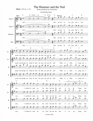 Choral Guitar,Piano,Vocal,Voice - Level 2 - Digital Download SKU: A0.801273 Composed by Connie Boss. A Cappella,Easter,Sacred. Score. 4 pages. Connie Boss #5044285. Published by Connie Boss (A0.801273). This song for Good Friday is in TTBB A capella. Tenor, Tenor, Baritone, Bass. It is a very moving piece. There is also a soloist in one section. It ends with the soloist and then... silence should be observed. This is in the perspective of Jesus and how he might have felt during his final hours. Very appropriate for a men's choir to sing it. See Lyrics below:[email protected]                                       The Hammer and the Nail                                               Good Friday Song                                                 Men’s A capella   Refrain: How can it be, the pain that I feel, pounding through my hands be from the hammer and the nail? When as a child, so young, but aware, I watched Joseph use the hammer and the nail. To create things that were so beautiful. How can this pain be from the hammer and the nail?   Verse Pound #1 What have I done Pound #2 They know not what they do Pound #3 I’m shaking in my knees Pound #4 Leads to many more   Refrain:   Verse Pound #5 I’m barely alive Pound #6 They poke me with a stick Pound #7 Soon I’ll be in heaven Pound #8 I’m feeling faint   Refrain:   Pound #9 I’m dying inside Pound #10 Father please forgive them Pound #11 I’m no longer breathin’ This product was created by a member of ArrangeMe, Hal Leonard’s global self-publishing community of independent composers, arrangers, and songwriters. ArrangeMe allows for the publication of unique arrangements of both popular titles and original compositions from a wide variety of voices and backgrounds. About Digital Downloads Digital Downloads are downloadable sheet music files that can be viewed directly on your computer, tablet or mobile device. Once you download your digital sheet music, you can view and print it at home, school, or anywhere you want to make music, and you don’t have to be connected to the internet. Just purchase, download and play! PLEASE NOTE: Your Digital Download will have a watermark at the bottom of each page that will include your name, purchase date and number of copies purchased. You are only authorized to print the number of copies that you have purchased. You may not digitally distribute or print more copies than purchased for use (i.e., you may not print or digitally distribute individual copies to friends or students).