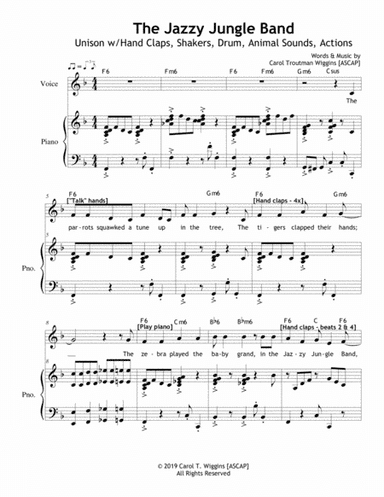 Choral Choir (Unison) - Level 1 - Digital Download SKU: A0.727542 Composed by Carol Troutman Wiggins. Children,Contemporary,Instructional,Jazz,Ragtime. Octavo. 5 pages. Carol Troutman Wiggins #4790445. Published by Carol Troutman Wiggins (A0.727542). The Jazzy Jungle Band Unison w/Hand Claps, Shakers, Drums, Animal Sounds, Actions**PERMISSION GRANTED TO MAKE 2 COPIES This fun, jazzy upbeat song will have your group singin’ and swingin’! Excellent for any age elementary Great for introducing jazz Instrument/Action cues included in score Chords included for additional instruments Add handclaps, maracas (or any shakers), drums, animal sounds, and actions Piano Accompaniment track on this site. This product was created by a member of ArrangeMe, Hal Leonard’s global self-publishing community of independent composers, arrangers, and songwriters. ArrangeMe allows for the publication of unique arrangements of both popular titles and original compositions from a wide variety of voices and backgrounds. About Digital Downloads Digital Downloads are downloadable sheet music files that can be viewed directly on your computer, tablet or mobile device. Once you download your digital sheet music, you can view and print it at home, school, or anywhere you want to make music, and you don’t have to be connected to the internet. Just purchase, download and play! PLEASE NOTE: Your Digital Download will have a watermark at the bottom of each page that will include your name, purchase date and number of copies purchased. You are only authorized to print the number of copies that you have purchased. You may not digitally distribute or print more copies than purchased for use (i.e., you may not print or digitally distribute individual copies to friends or students).