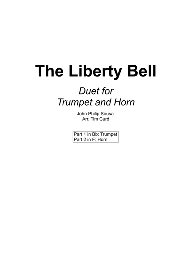 Trumpet Duet Trumpet - Level 3 - Digital Download SKU: A0.1251582 Composed by John Philip Sousa. Arranged by Tim Curd. 19th Century,Film/TV,March,Patriotic. Score. 9 pages. Tim Curd #845859. Published by Tim Curd (A0.1251582). The Liberty Bell for Trumpet DuetThe Liberty Bell is a famous patriotic march written in 1893 by John Philip Sousa.Score and Parts included:Part 1 in Bb: TrumpetPart 2 in Bb: Trumpet. This product was created by a member of ArrangeMe, Hal Leonard's global self-publishing community of independent composers, arrangers, and songwriters. ArrangeMe allows for the publication of unique arrangements of popular titles and original compositions from a variety of voices and backgrounds. The length, difficulty, and retail pricing are determined solely by the discretion of the person who arranged or composed it. About Digital Downloads Digital Downloads are downloadable sheet music files that can be viewed directly on your computer, tablet or mobile device. Once you download your digital sheet music, you can view and print it at home, school, or anywhere you want to make music, and you don’t have to be connected to the internet. Just purchase, download and play! PLEASE NOTE: Your Digital Download will have a watermark at the bottom of each page that will include your name, purchase date and number of copies purchased. You are only authorized to print the number of copies that you have purchased. You may not digitally distribute or print more copies than purchased for use (i.e., you may not print or digitally distribute individual copies to friends or students).