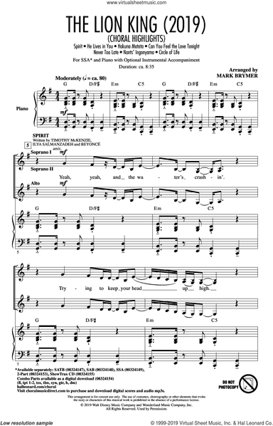 (Full Performance) - Digital Download SKU: HX.452504 Composed by Beyonce, Elton John, Hans Zimmer, Ilya Salmanzadeh, Jay Rifkin, Lebohang Morake, Mark Mancina, Tim Rice, and Timothy McKenzie. Arranged by Mark A. Brymer. African,Broadway,Disney,Film/TV,Musical/Show. Choral. Duration 519. Published by Hal Leonard - Digital (HX.452504). About MP3s at Sheet Music Plus You can now purchase MP3s for download from Sheet Music Plus! You'll find a variety of MP3s from instrumental play alongs to choral accompaniment tracks to great new music from emerging and established artists. After purchase, you can download your MP3 from your Sheet Music Plus Digital Library - no software installation is necessary! You can also listen to your MP3 at any time in your Digital Library.