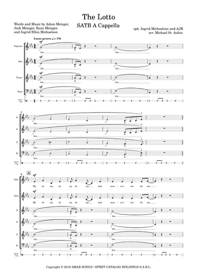 Choral Choir (SATB divisi) - Level 3 - Digital Download SKU: A0.1103521 By Ajr & Ingrid Michaelson. By Adam Metzger, Ingrid Ellen Michaelson, Jack Metzger, and Ryan Metzger. Arranged by Michael St. Aubin. A Cappella,Contemporary,Pop. Octavo. 16 pages. Michael St. Aubin #706791. Published by Michael St. Aubin (A0.1103521). This arrangement of Ingrid Michaelson and AJR's "The Lotto" by Michael St. Aubin is a simply fun and lighthearted piece for any contemporary SATB A Cappella group. This version features a treble / bass duet and a moving bass line with plenty of clapping. This product was created by a member of ArrangeMe, Hal Leonard’s global self-publishing community of independent composers, arrangers, and songwriters. ArrangeMe allows for the publication of unique arrangements of both popular titles and original compositions from a wide variety of voices and backgrounds. About Digital Downloads Digital Downloads are downloadable sheet music files that can be viewed directly on your computer, tablet or mobile device. Once you download your digital sheet music, you can view and print it at home, school, or anywhere you want to make music, and you don’t have to be connected to the internet. Just purchase, download and play! PLEASE NOTE: Your Digital Download will have a watermark at the bottom of each page that will include your name, purchase date and number of copies purchased. You are only authorized to print the number of copies that you have purchased. You may not digitally distribute or print more copies than purchased for use (i.e., you may not print or digitally distribute individual copies to friends or students).