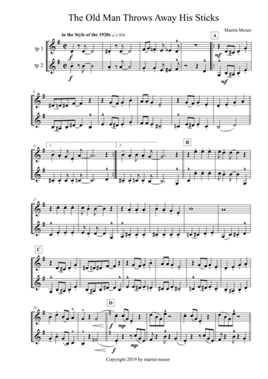 Trumpet Duet Trumpet - Level 3 - Digital Download SKU: A0.977660 Composed by Martin Moser. Traditional. Score. 2 pages. Martin Moser #4766773. Published by Martin Moser (A0.977660). I wrote this piece for my trumpet students. Attached to the demo you will find a playback. The piece can also be played without accompaniment. This product was created by a member of ArrangeMe, Hal Leonard’s global self-publishing community of independent composers, arrangers, and songwriters. ArrangeMe allows for the publication of unique arrangements of both popular titles and original compositions from a wide variety of voices and backgrounds. About Digital Downloads Digital Downloads are downloadable sheet music files that can be viewed directly on your computer, tablet or mobile device. Once you download your digital sheet music, you can view and print it at home, school, or anywhere you want to make music, and you don’t have to be connected to the internet. Just purchase, download and play! PLEASE NOTE: Your Digital Download will have a watermark at the bottom of each page that will include your name, purchase date and number of copies purchased. You are only authorized to print the number of copies that you have purchased. You may not digitally distribute or print more copies than purchased for use (i.e., you may not print or digitally distribute individual copies to friends or students).