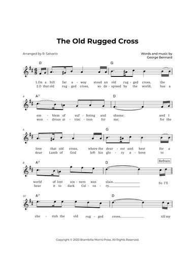 C Instrument - Digital Download SKU: A0.1290412 By George Bennard. By George Bennard. Arranged by R. Salvario. Folk,Multicultural,Praise & Worship,Sacred,Traditional,World. Lead Sheet / Fake Book. 2 pages. Brambilla-Morris Press #881122. Published by Brambilla-Morris Press (A0.1290412). The Old Rugged Cross (Key of C Major)This is an arrangement for the song The Old Rugged Cross; you will love how it sounds! You will get the individual part when you download the PDF. This product was created by a member of ArrangeMe, Hal Leonard’s global self-publishing community of independent composers, arrangers, and songwriters. ArrangeMe allows for the publication of unique arrangements of both popular titles and original compositions from a wide variety of voices and backgrounds. About Digital Downloads Digital Downloads are downloadable sheet music files that can be viewed directly on your computer, tablet or mobile device. Once you download your digital sheet music, you can view and print it at home, school, or anywhere you want to make music, and you don’t have to be connected to the internet. Just purchase, download and play! PLEASE NOTE: Your Digital Download will have a watermark at the bottom of each page that will include your name, purchase date and number of copies purchased. You are only authorized to print the number of copies that you have purchased. You may not digitally distribute or print more copies than purchased for use (i.e., you may not print or digitally distribute individual copies to friends or students).